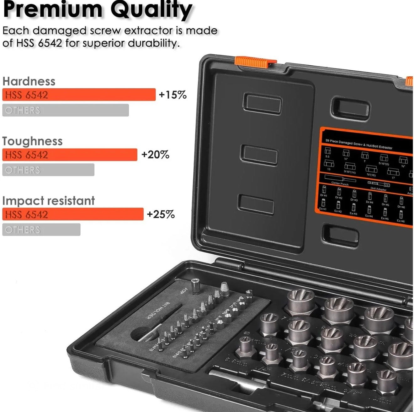 All 39 pieces come neatly packed in a heavy-duty blow-molded case, ensuring organized storage and quick access when you need it. No more misplaced tools or loose extractors rolling around in your toolbox.