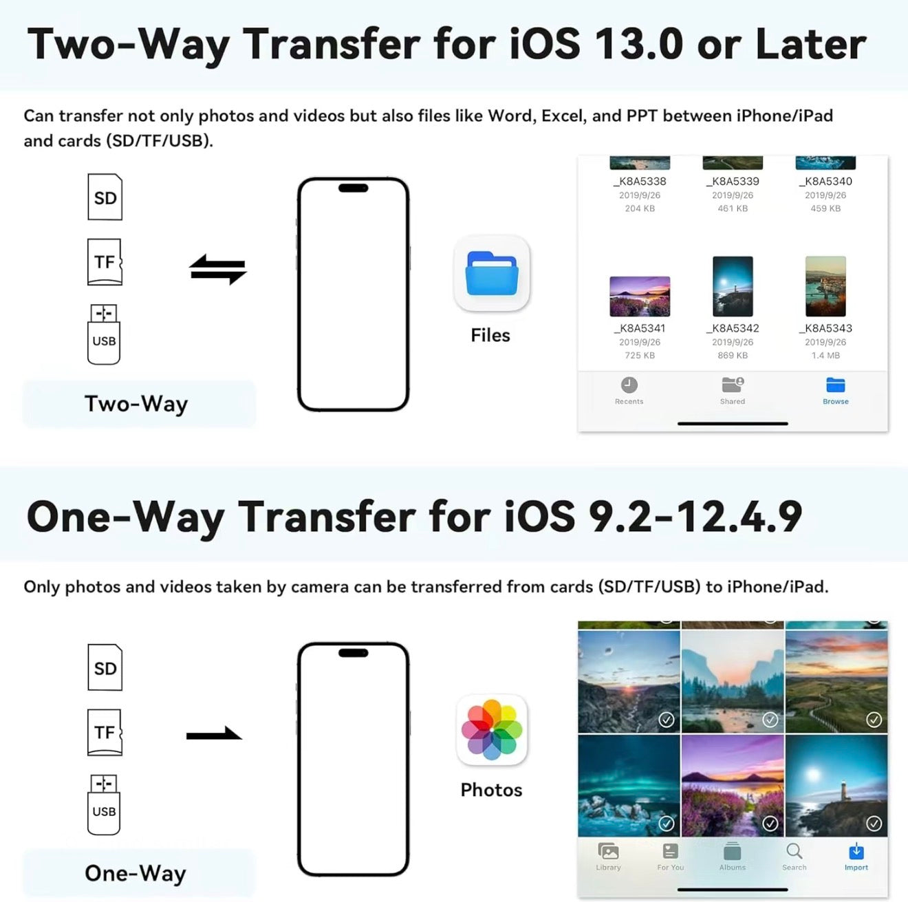 No app or driver installation required. Just connect, open your Files or Photos app, and start transferring instantly. Compatible with iOS 9.2 and above (one-way transfer for older versions, two-way for iOS 13+).