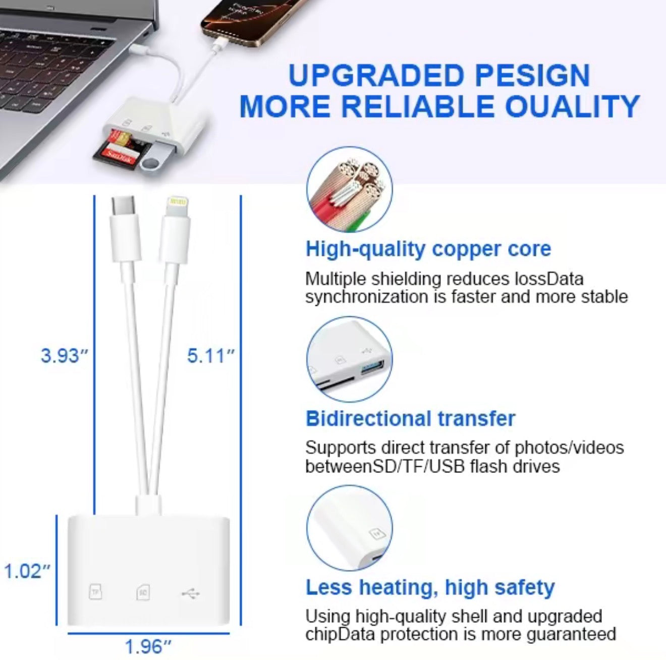 Equipped with USB-C and Lightning connectors, this compact card reader connects seamlessly to iPhone, iPad (Pro/Air/Mini), MacBook, Android phones, and tablets, offering universal access without the need for adapters or apps.
