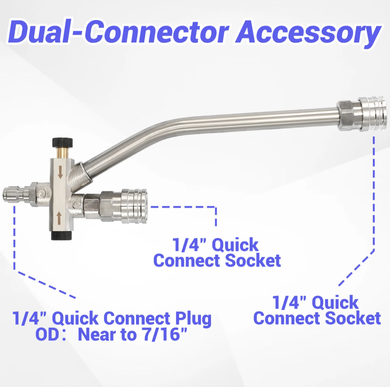 Dual Connector Design – Features two connector ends: a longer end for the pressure wash nozzle and a shorter end for the snow foam lance, ensuring uninterrupted water flow even when the foam dispenser is attached.