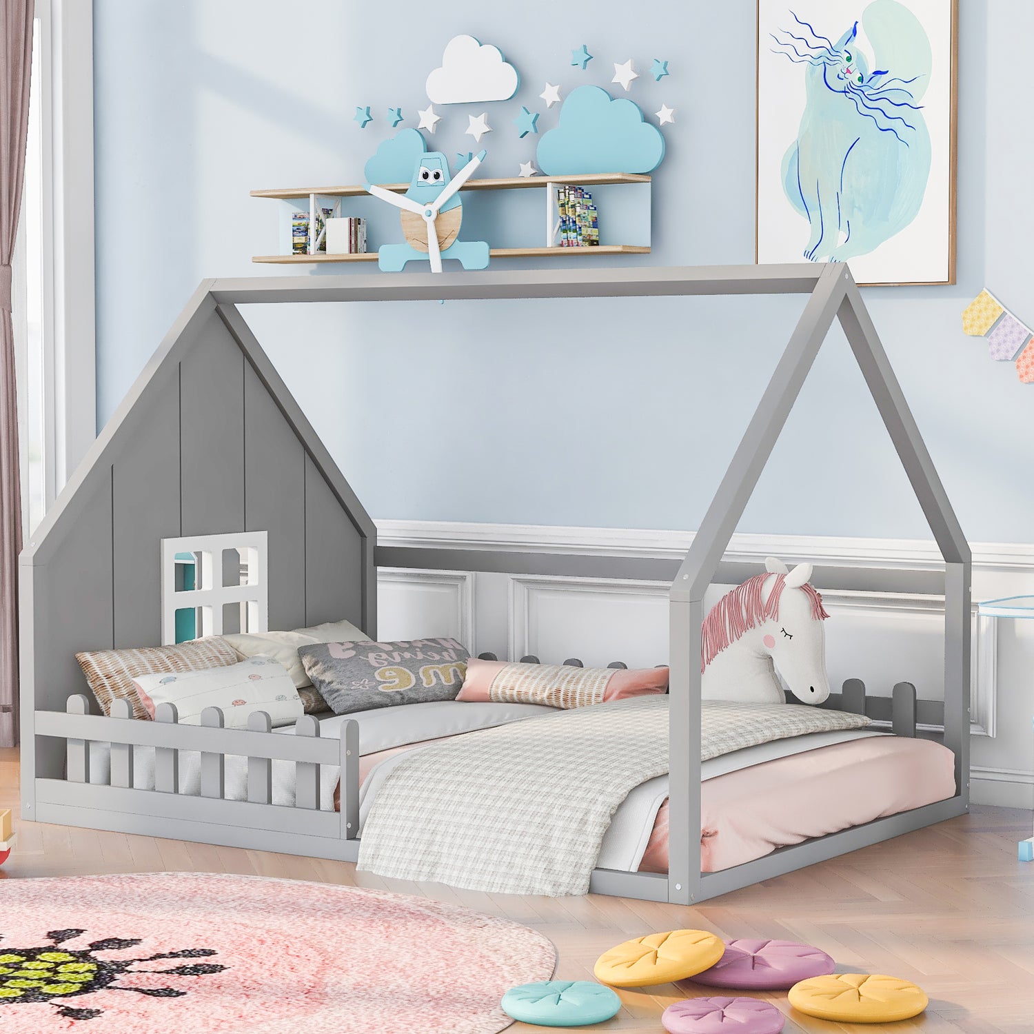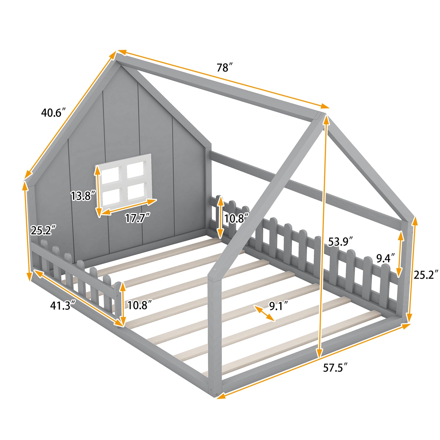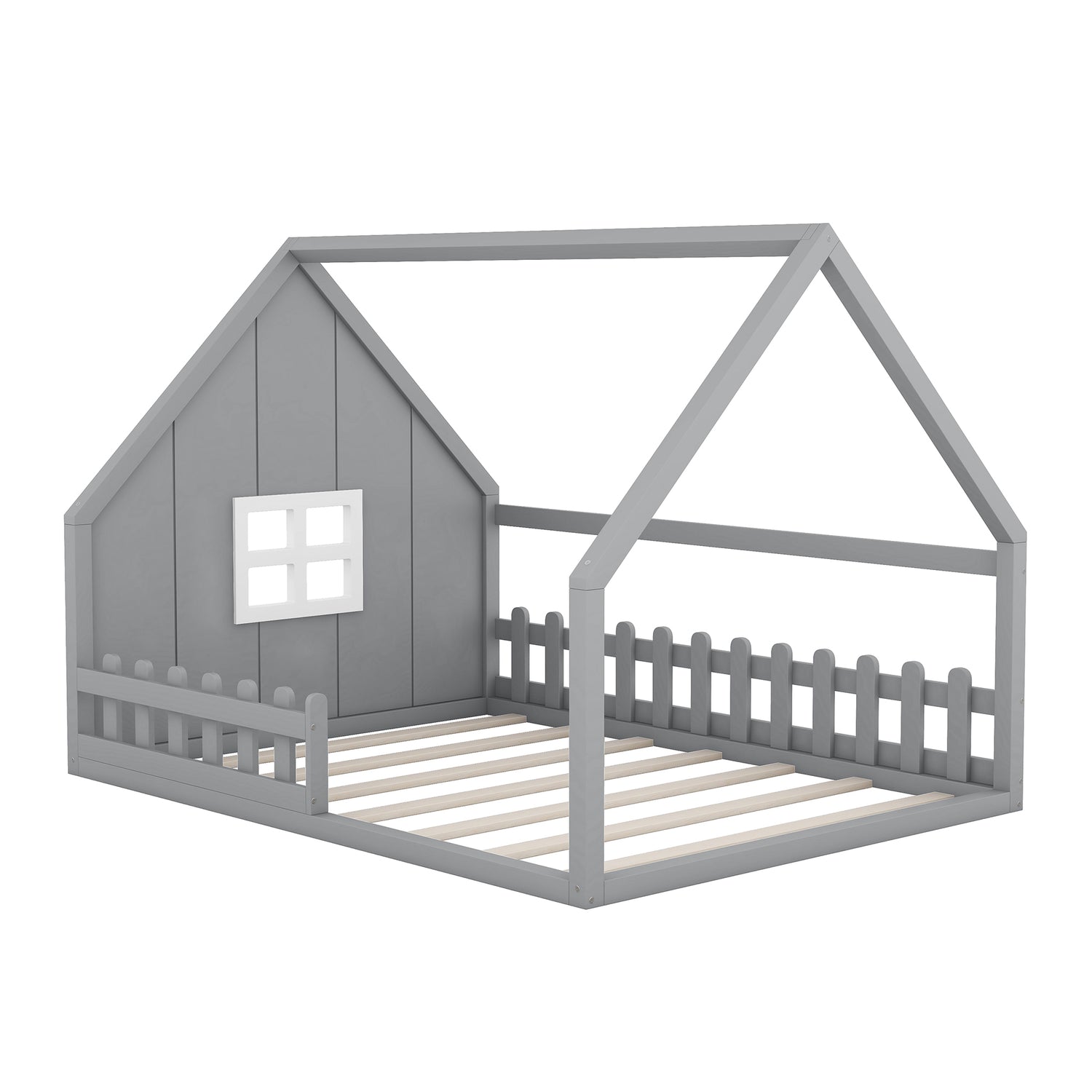 Full Size Wood House Bed with Window and Fence, Gray