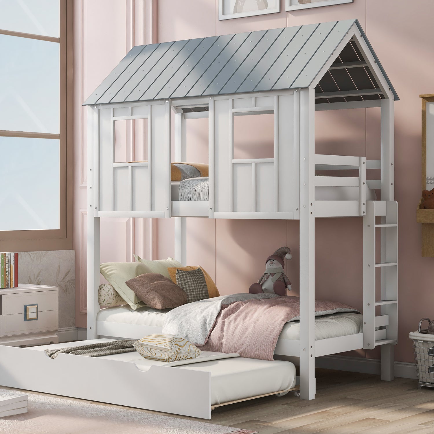 House Bunk Bed with Trundle,Roof and Windows White
