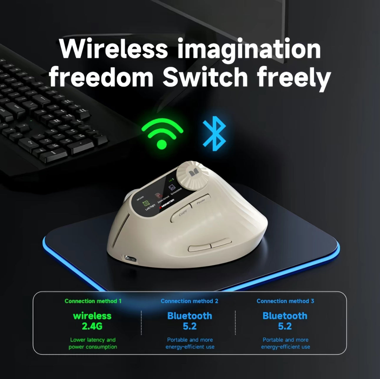 Multi-Device Connectivity: Connect effortlessly with 2.4G wireless or switch between dual Bluetooth channels (BT1 + BT2)—perfect for multitasking across laptops, tablets, and desktops.