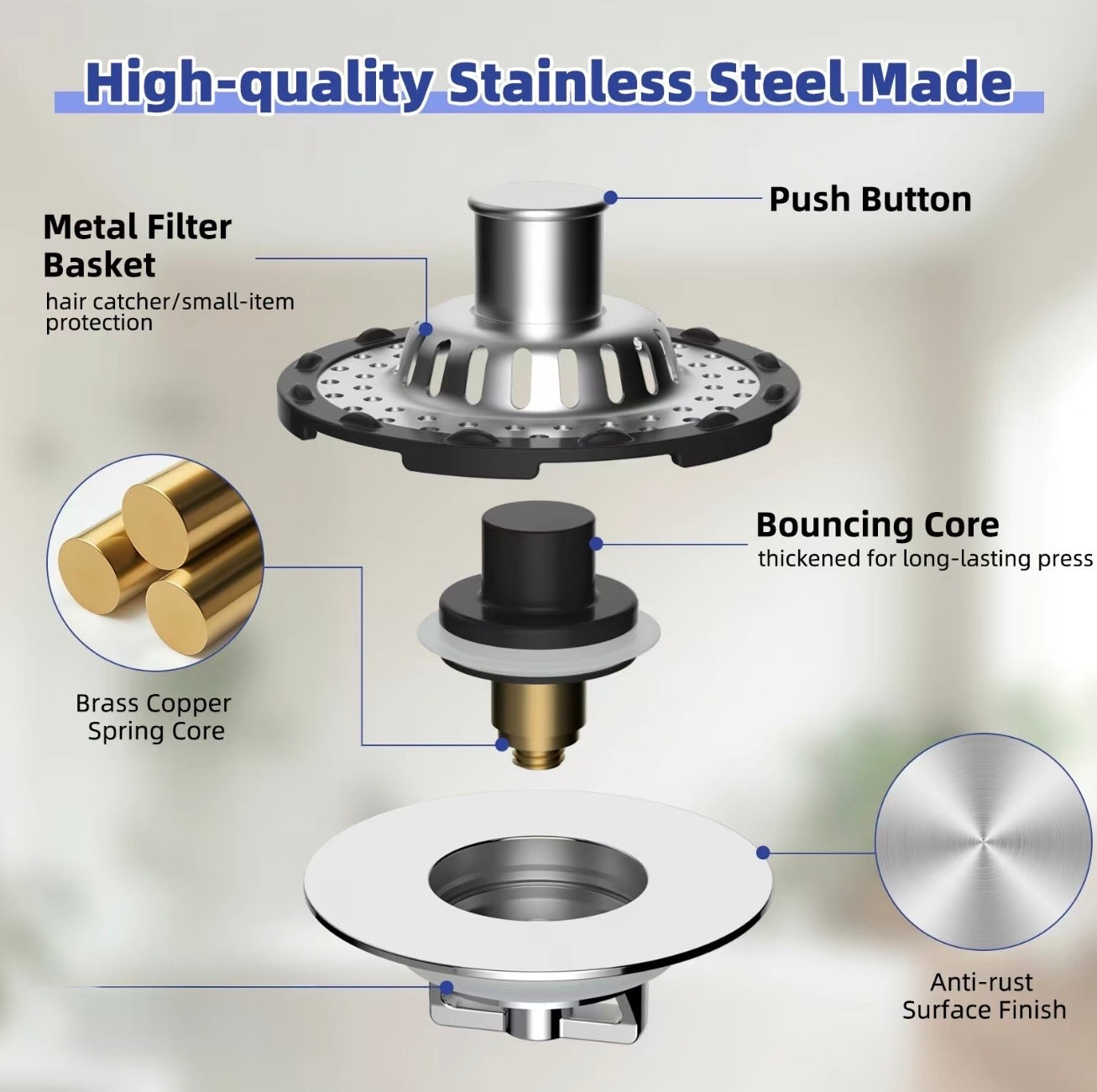 • High-Quality Construction: Sturdy stainless steel base, pop-up brass core mechanism, and rubber washers ensure a tight seal and durability.