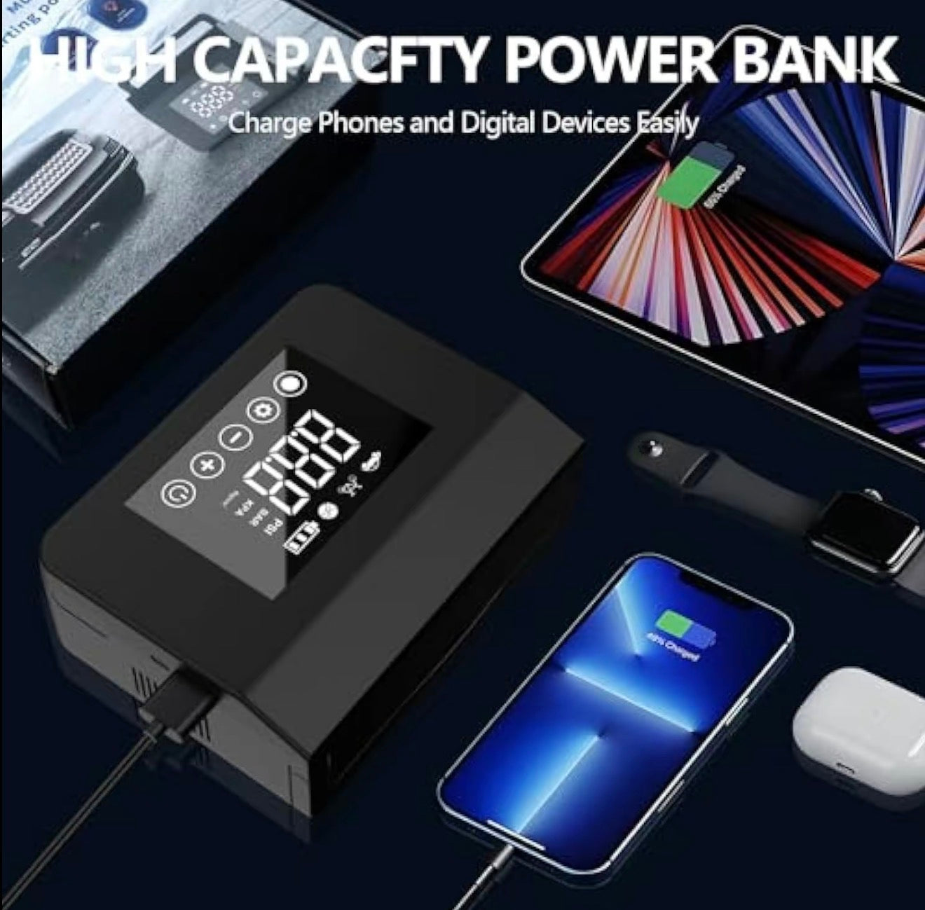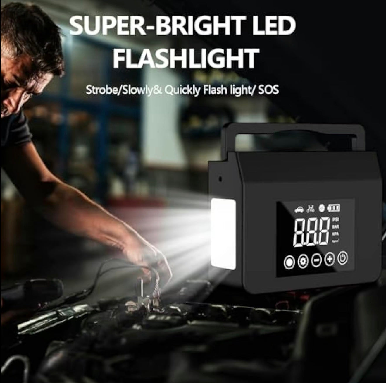 - Replaces 5 tools in one: jump starter, air pump, power bank, flashlight, emergency signal