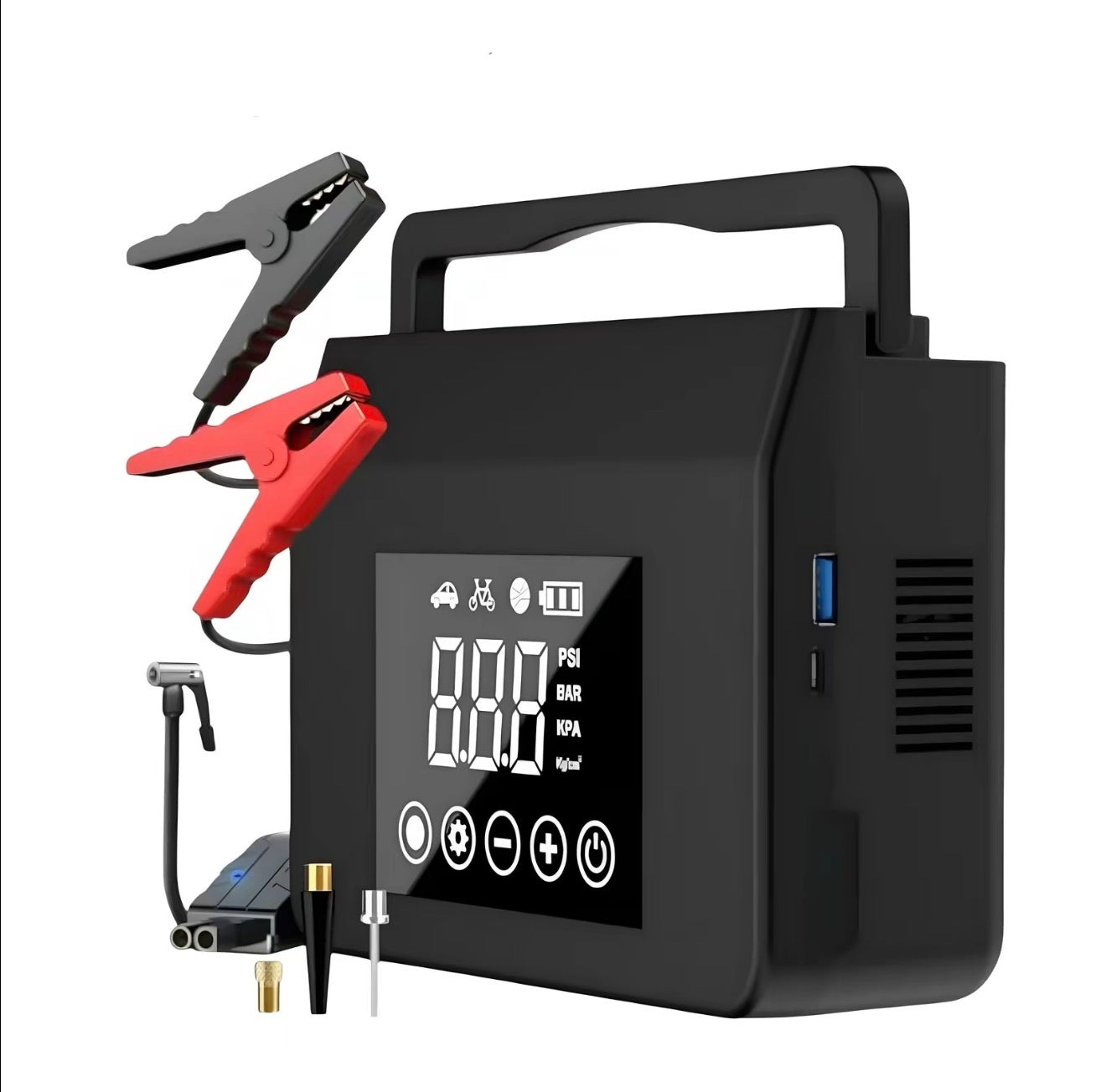 Jump-start your vehicle in four easy steps—no professional skills required. The package includes everything you need: jump clamps, air hose, and multiple nozzles.