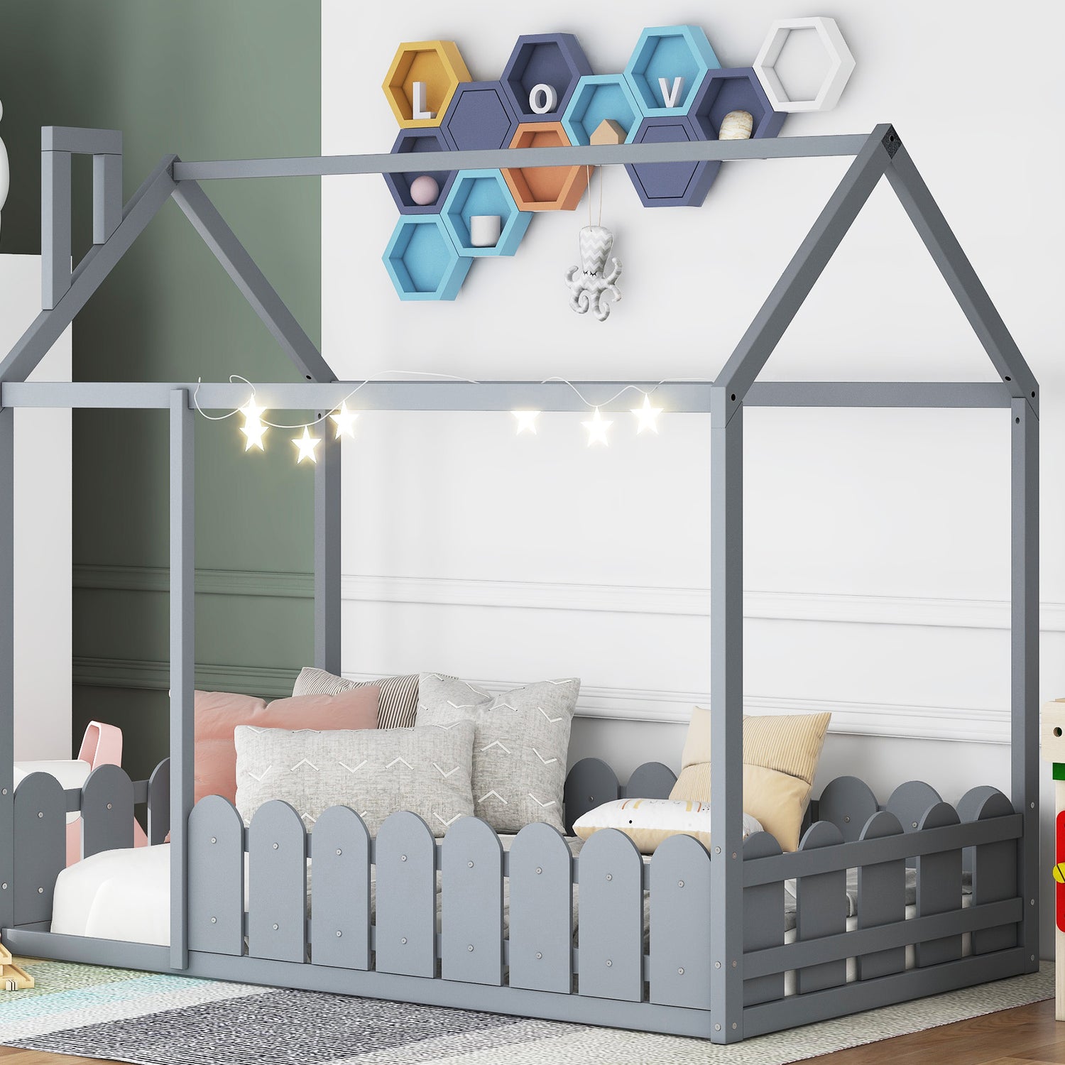 {Slats are not included}Twin Size Wood Bed House Bed Frame with Fence for Kids Teens Girls Boys {Gray}