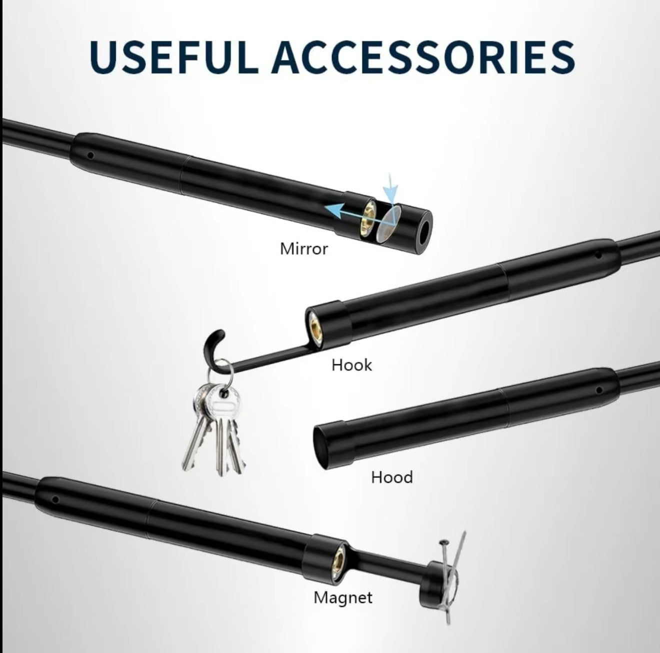 - Includes accessories: magnet, hook, mirror, protective hood, and manual