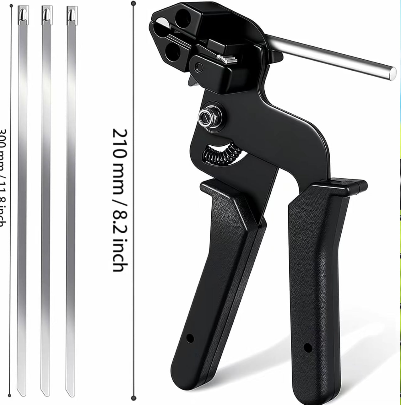 Comes with a durable metal zip tie gun and 100 stainless steel cable ties (11.8” / 4.6mm x 300mm). Compatible with ties up to 0.47” width and 0.01” thickness, ensuring reliable performance for multiple uses. -