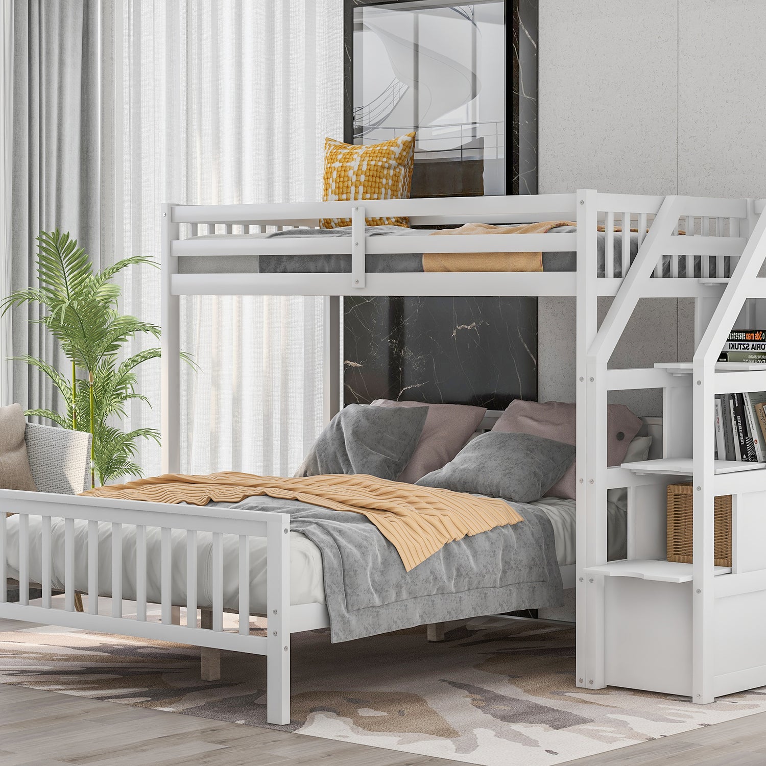 Twin over Full Loft Bed with Staircase,White(OLD SKU:SM000107AAK)
