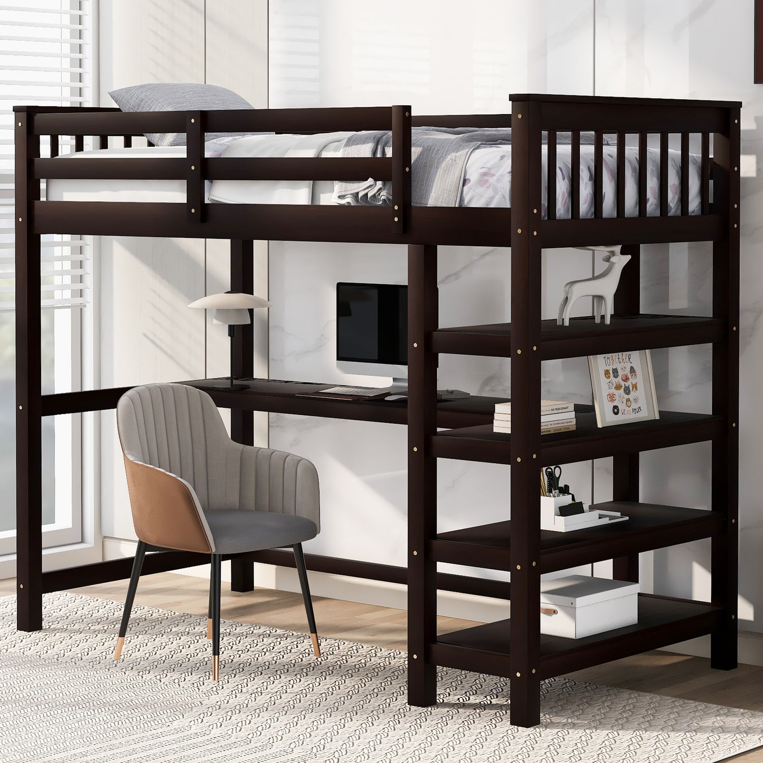 Twin Size Loft Bed with Storage Shelves and Under-bed Desk, Espresso