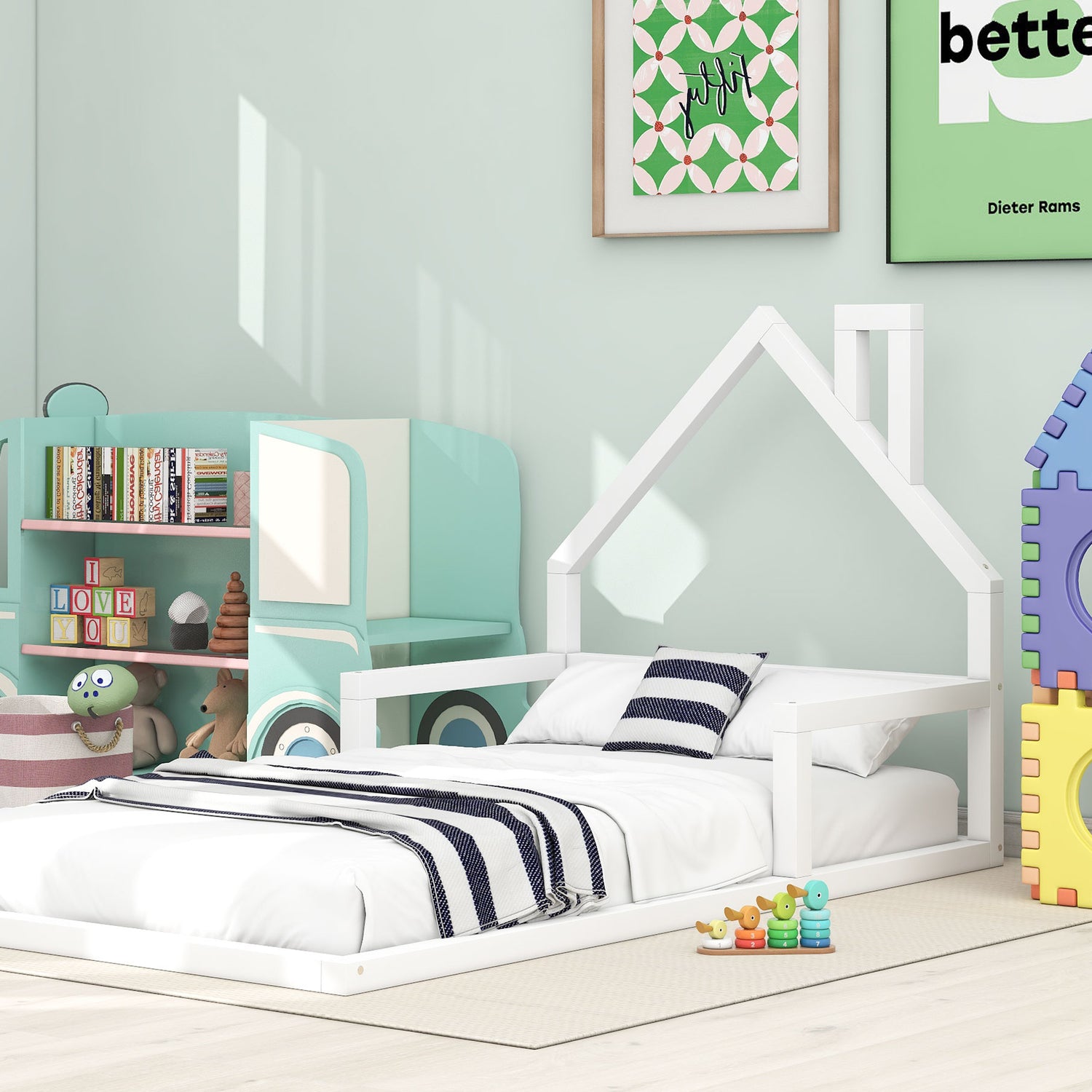 Twin Size Wood Floor Bed with House-shaped Headboard, White