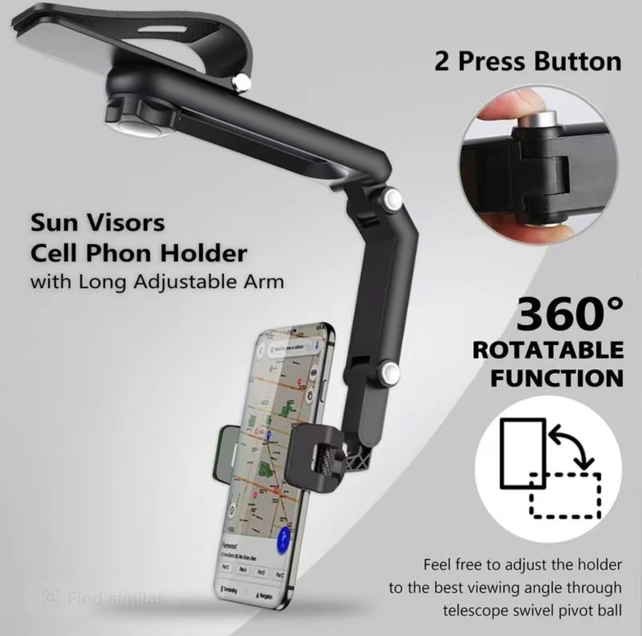 - 1080° Rotating Sun Visor Mount: With full 360° horizontal rotation and 180° vertical tilt, this mount ensures perfect viewing from any angle. Ideal for calls, GPS, or videos—all within safe view while driving.