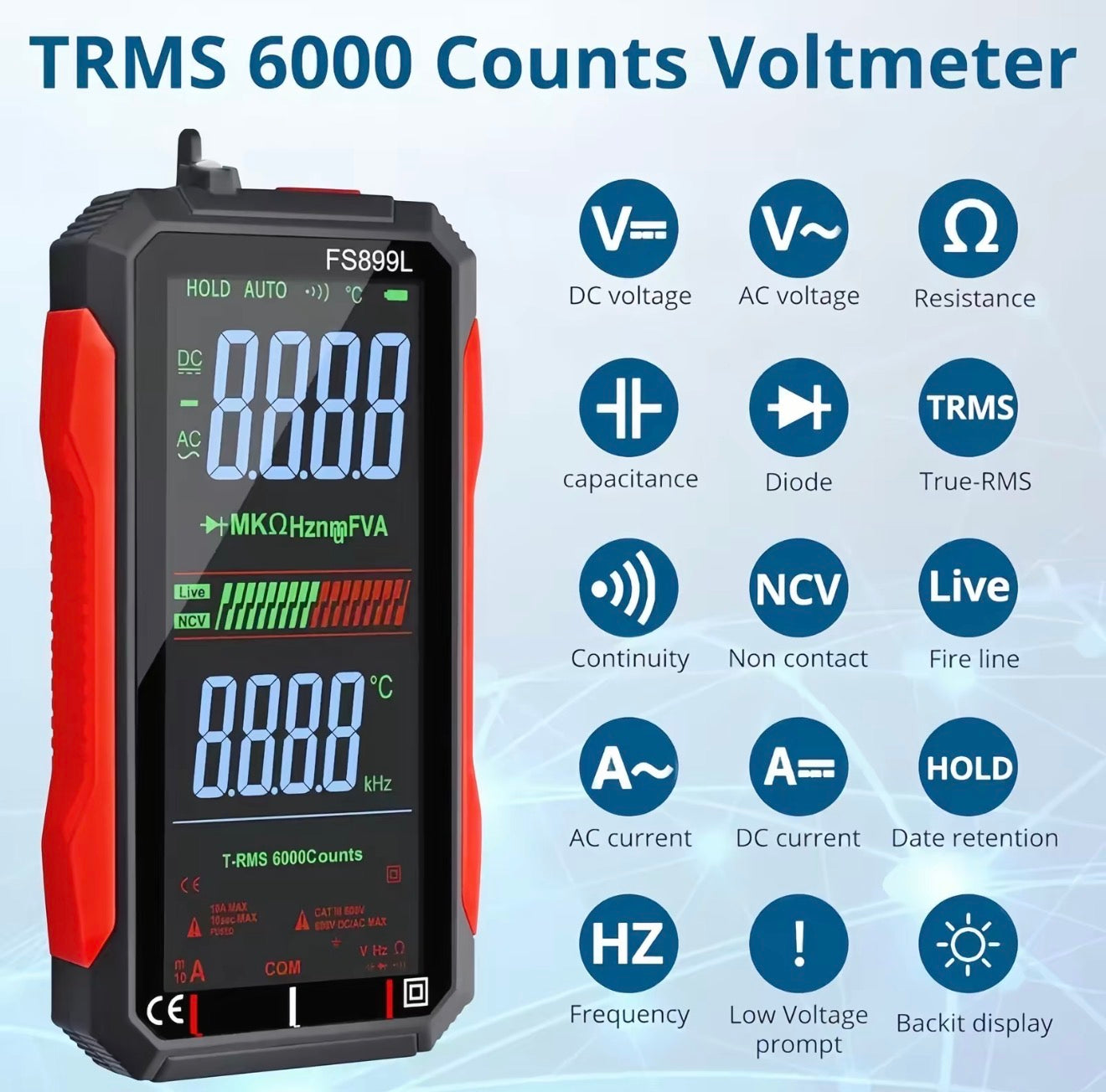 The VoltMaster Tester is a professional-grade digital multimeter designed for accurate, safe, and efficient electrical testing across home, automotive, and industrial applications. With True RMS technology and a 6000-count display, it delivers precise readings even on complex or unstable signals—making it a dependable tool for electricians, technicians, and DIY users alike.