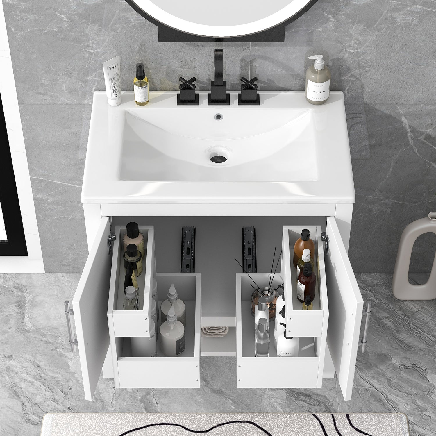 Multi-functional Drawers: This vanity cabinet inside is designed as functional storage: two drawers with slides underneath can be pull out and in, which is convenient for you to take stuff. Moreover, each drawer has two up and down parts to place necessities in different size.