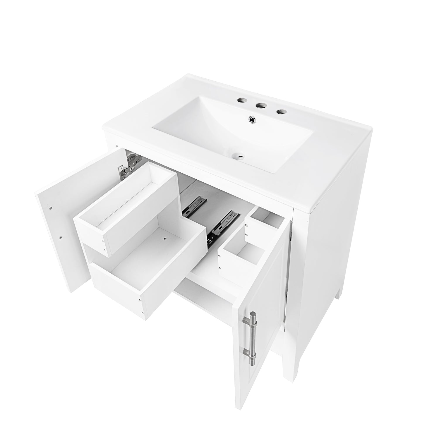 Stylish Bathroom Vanity: This bathroom vanity is suitable for bathroom in any decoration style. Freestanding white vanity cabinet with silver handles complies with your bathroom facilities. The groove design on the door increases the artistry and aesthetics of home. If you're looking for a simple but stylish bathroom sink vanity, our product will be a great choice to upgrade your bathroom.