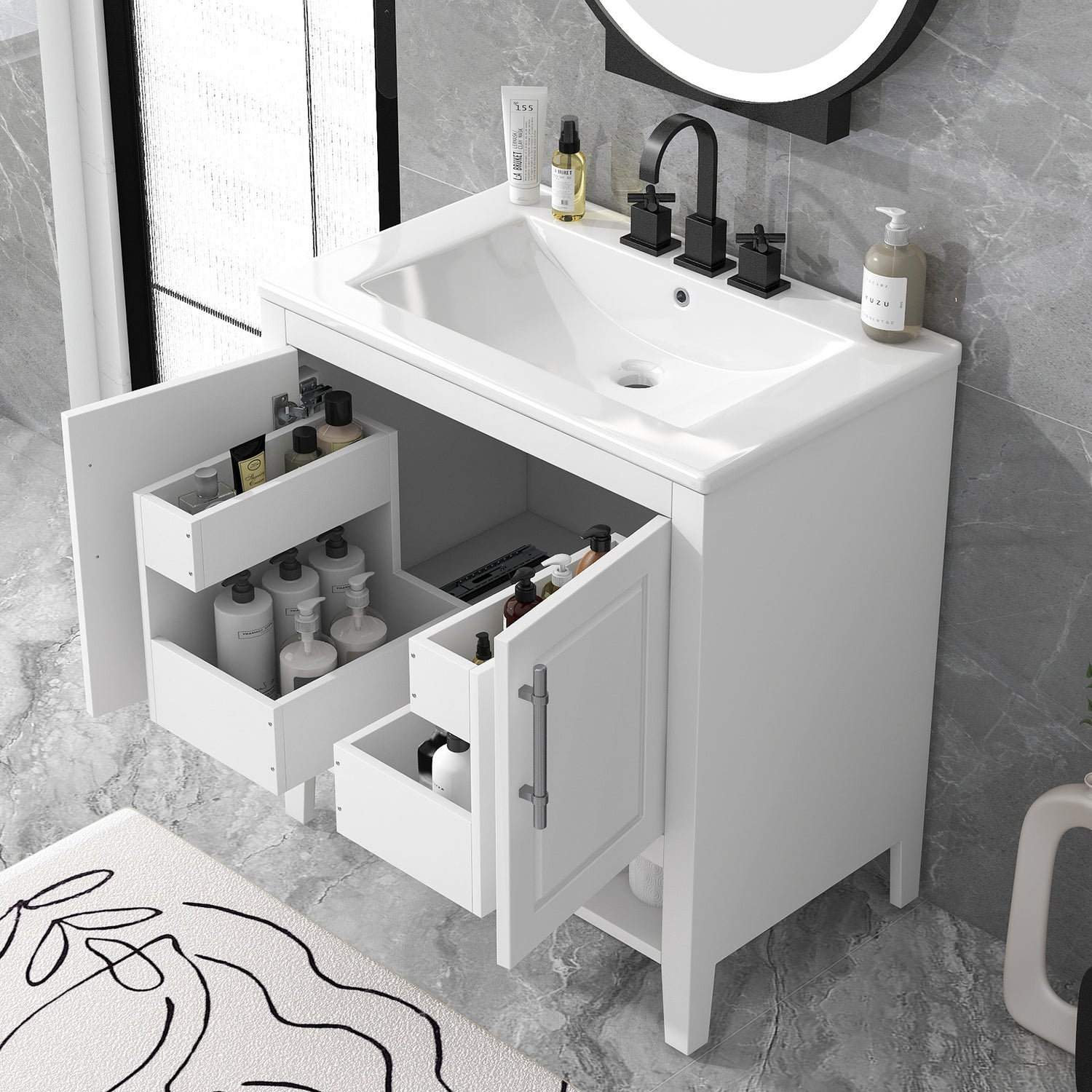 30" Bathroom Vanity with Sink Multi-functional Bathroom Cabinet with Doors and Drawers Solid Frame and MDF Board, White