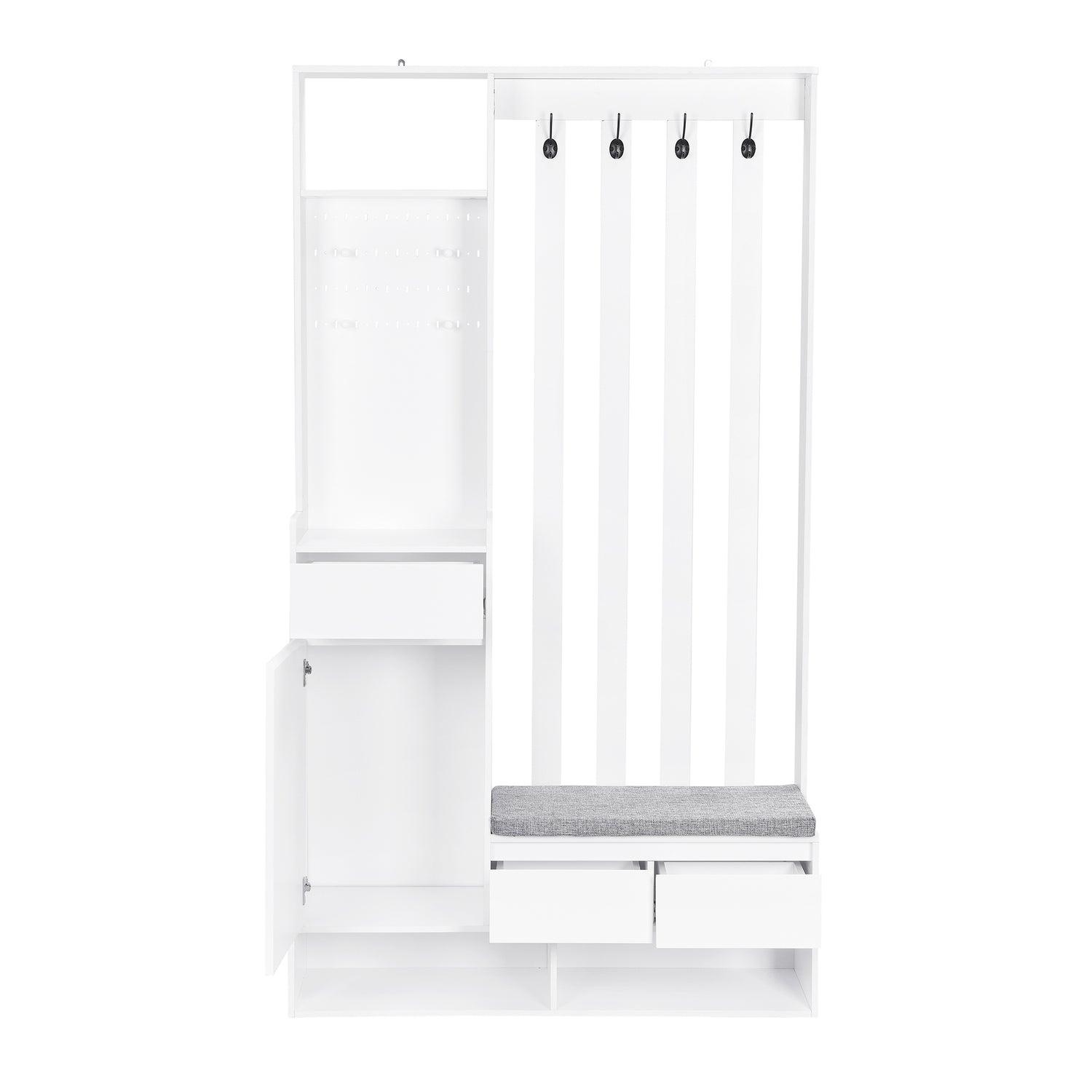 Our all-in-one hall tree bids farewell to entryway chaos! This sleek unit integrates shelf space, storage cabinet, pegboard, drawer, 4 coat hooks, and seating bench, offering a complete solution to maintain a tidy and organized entrance.