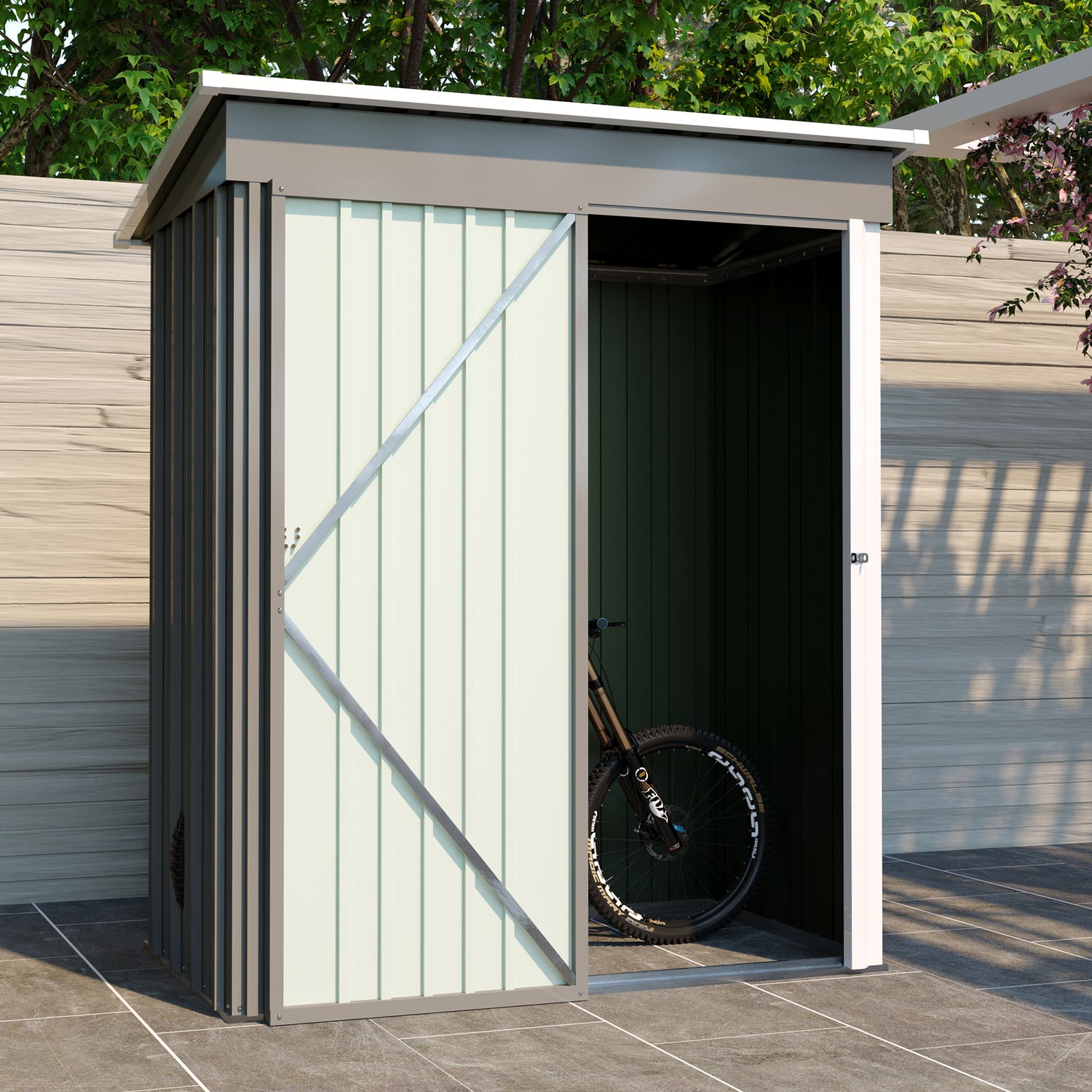 The 5 X 3 outdoor storage shed is perfect for your outdoor storage needs.This metal garden shed can store your snow blowers, shovels, outdoor chairs, bicycles, and toy cars.You can also buy some storage racks to hang on your outdoor storage shed to organize your shovels, umbrellas, antennas, escalators, and more.