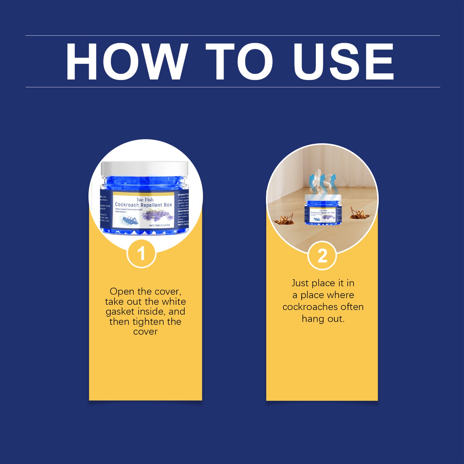 Our Cockroach Repellent Box contains Camphor Tree Oil, Lavender Essential Oil, Peppermint Extract. It can continuously release the active ingredients, maintain the indoor environment for a long time, and prevent cockroaches from invading again. Its use is very simple: open the lid, take out the white washer inside, then tighten the lid, and put it in the area where cockroaches are often found. Can be a powerful cockroach repellent, the effect is remarkable. And effectively reduce the number of cockroaches.