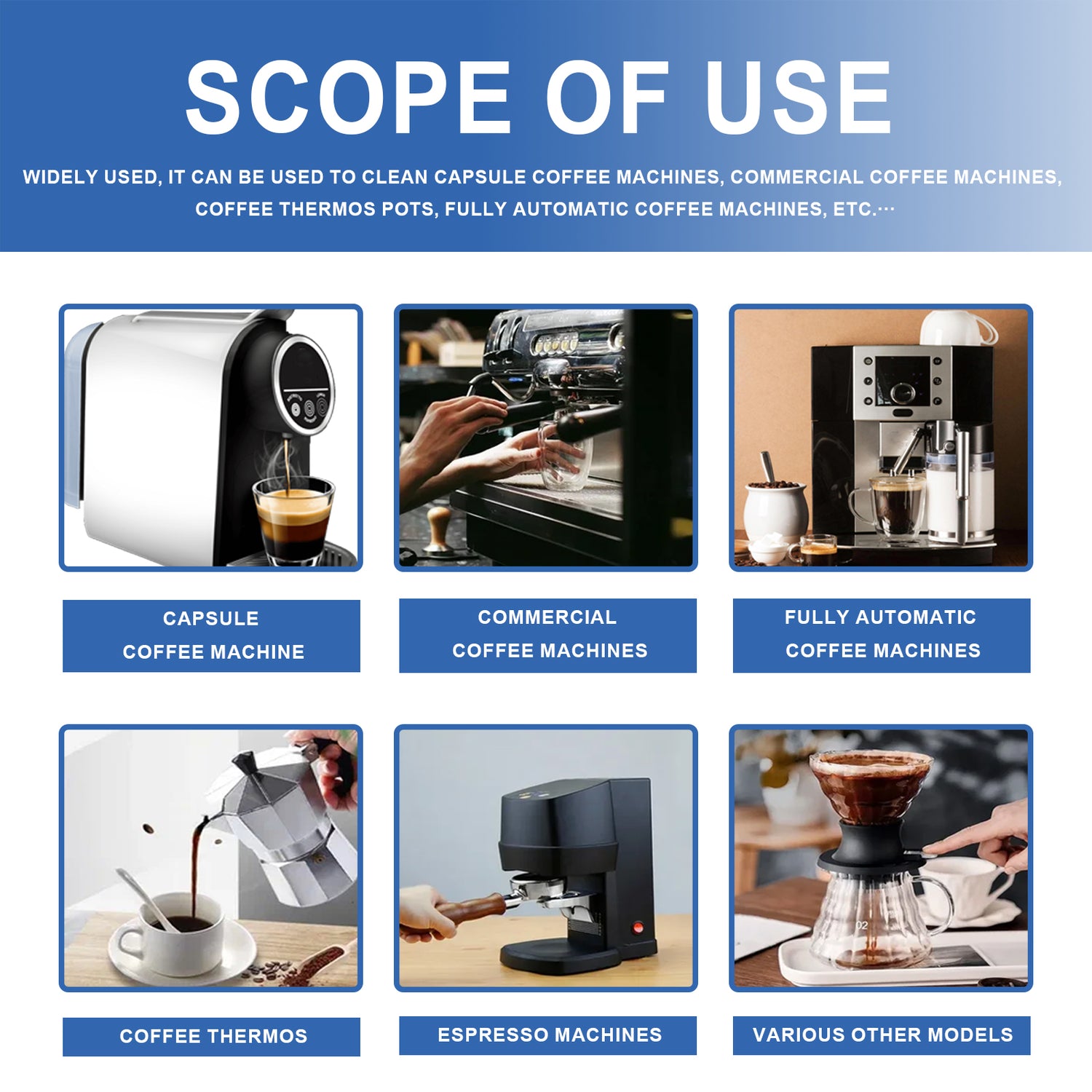 Our coffee machine cleaning tablets contain sodium bicarbonate and citric acid. It can be strong cleaning, can deeply clean the coffee machine, thoroughly clean the coffee grounds, coffee oil and other dirt, help to remove the odor inside the coffee machine, so that the coffee machine will not affect the taste and aroma of the coffee when making coffee. Its use method is very simple: put the filter basket and filter on the top before use, add the right amount of water and run the coffee machine for cleaning. It can clean the internal parts of the coffee machine, reduce blockage and failure, and extend the service life of the coffee machine.