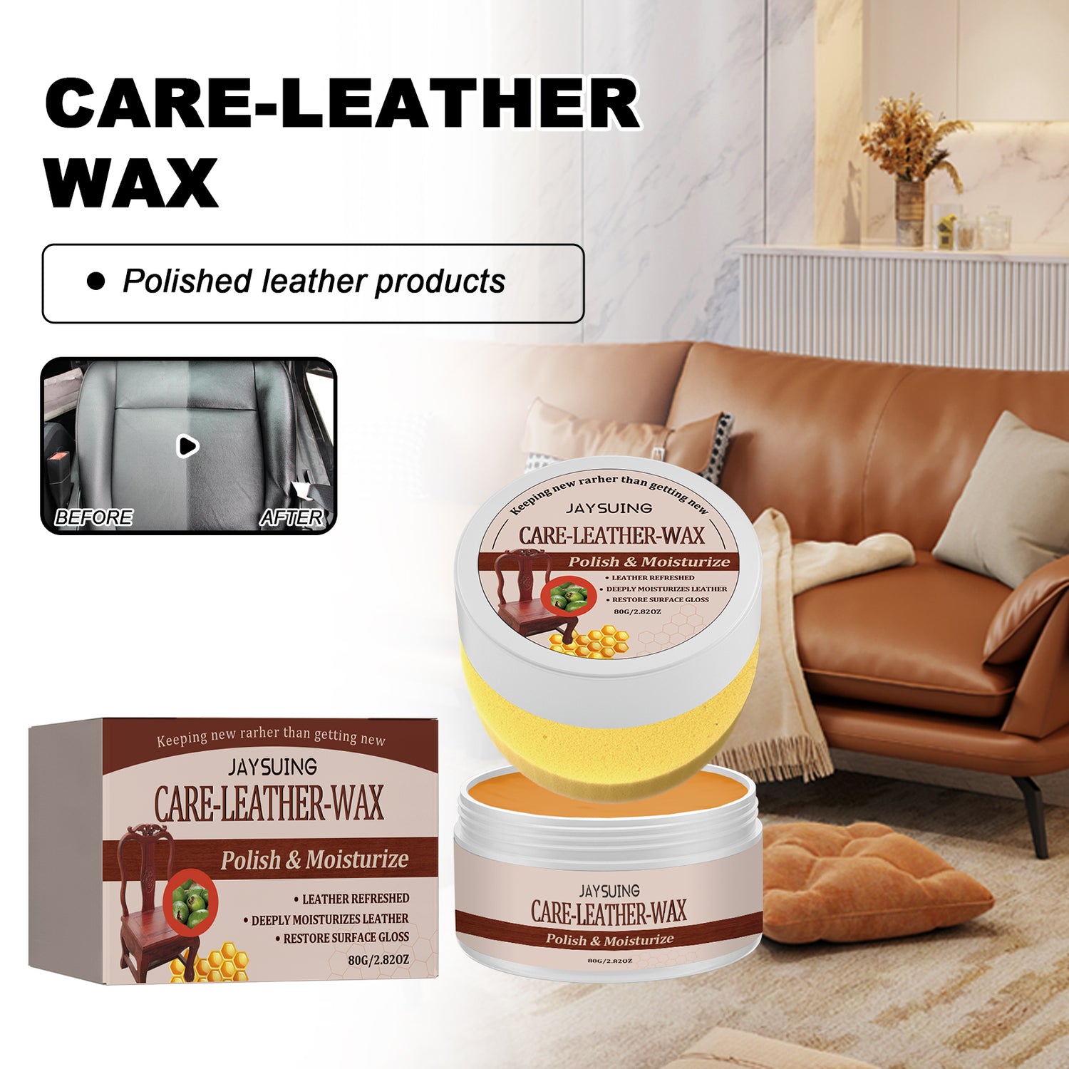 Our leather care waxes contain beeswax, orange oil and palm wax. It can form a protective coating surface on the surface, waterproof, wear-resistant and sun-resistant, prevent the leather surface from drying and cracking, and keep your leather as good as new. Its use method is very simple: suitable for uniform leather surface; Wipe the surface evenly with a sponge; Wipe clean with a rag; Restore the original luster. Easy to use, just wipe it back to restore it to a polished state, helping to save you time and effort; No damage to the leather surface, giving you more peace of mind when using.