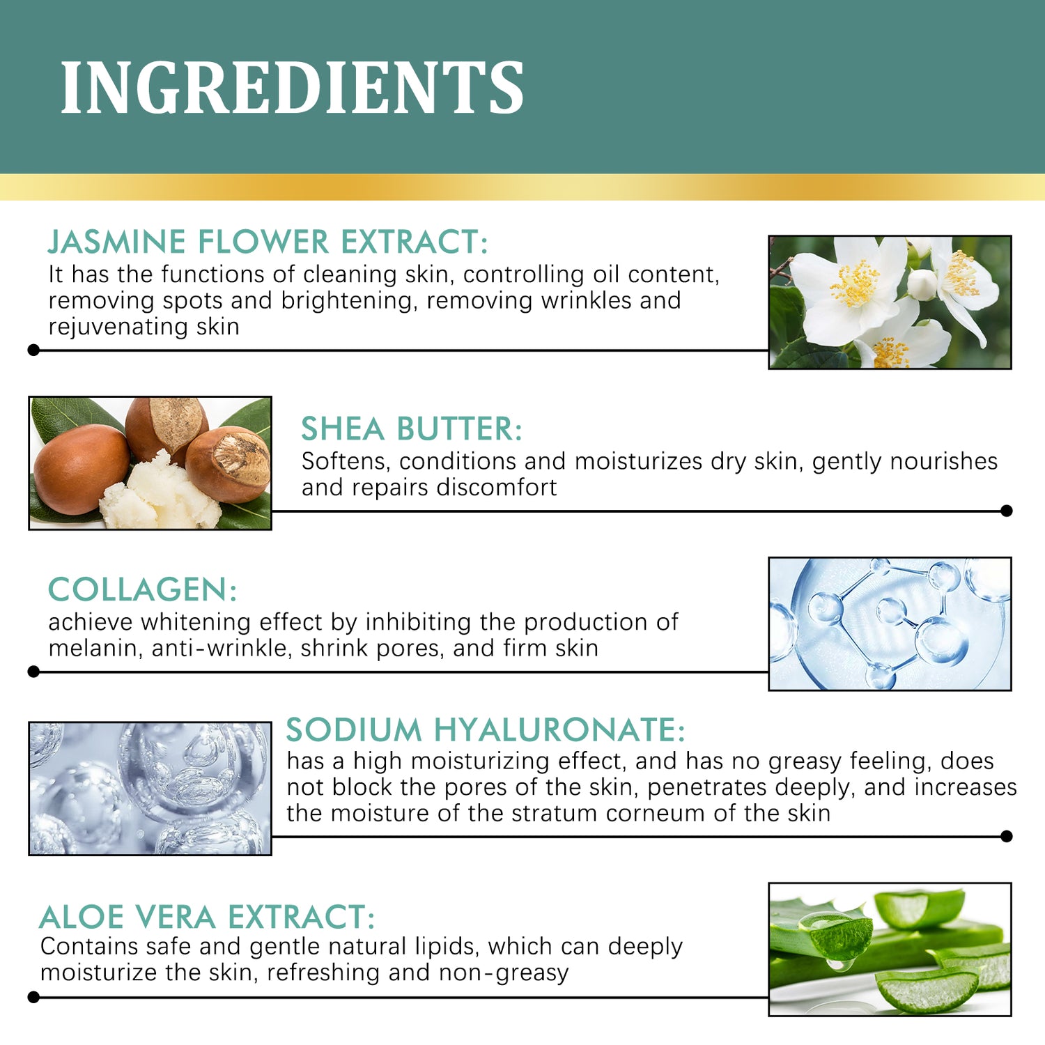 Our lightening dark circles eye cream contains jasmine flower extract and shea butter. It can repair and moisturize, effectively hydrate, reduce the appearance of fine lines and wrinkles, help brighten and tighten the skin around the eyes, and make tired eyes glow and rejuvenate. Its application is simple: clean and dry your face and eyes; Apply an appropriate amount of eye cream around your eyes and gently massage with your fingertips in a circular motion from the inside out until absorbed, without pulling on the skin. It also nourishes the delicate skin around the eyes.