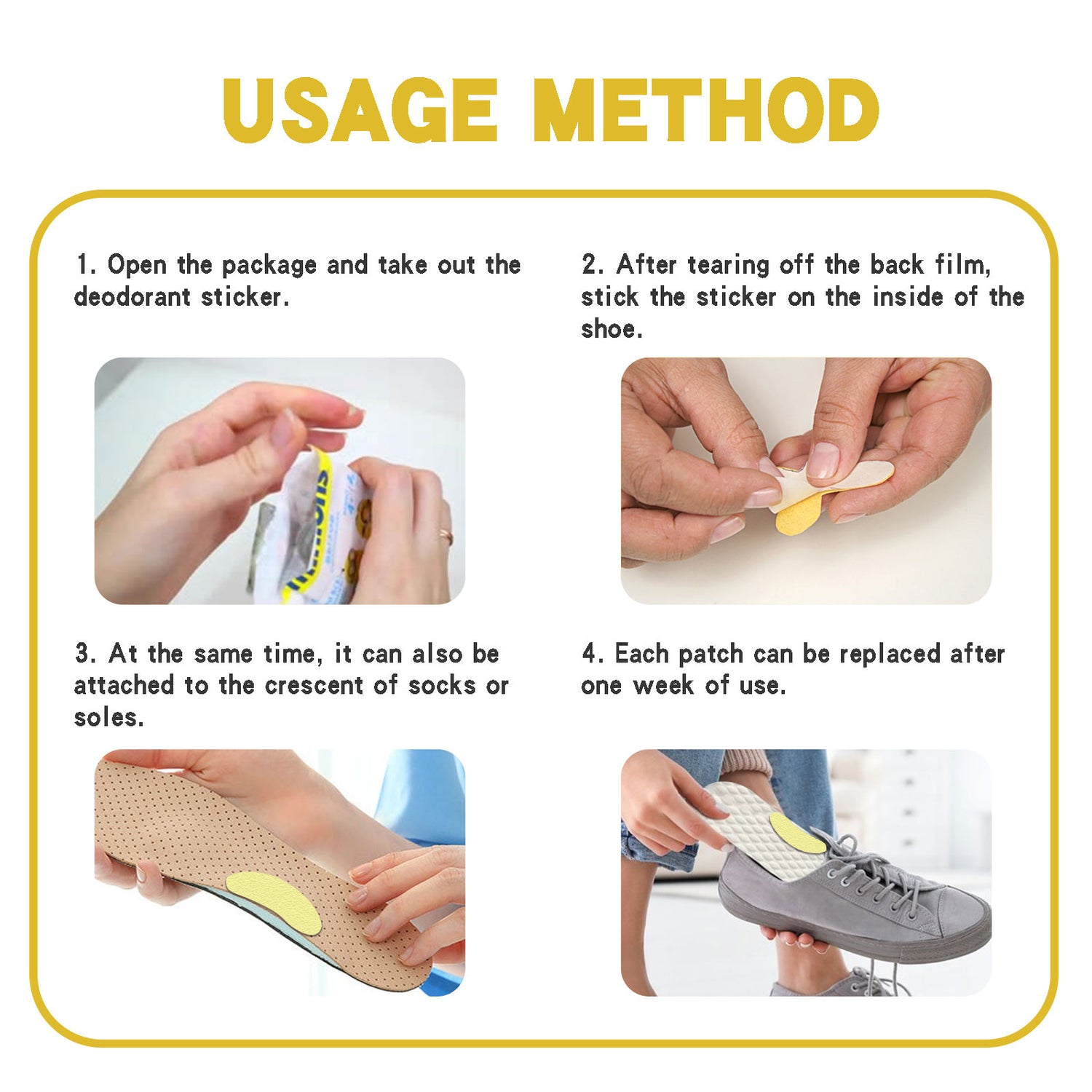 Our Stop Odor Shoe Deodorant Patch contain lemon extract, lavender and snake seed. It can sterilize and deodorize shoes and socks, and remove the odor caused by sweat. The way to use it is simple: open the package, take out the deodorant sticker, peel off the back of the film, attach the sticker to the inside of the shoe, or it can also be attached to the crescent of the sock or sole, and replace each patch after a week of use. Absorb foot sweat, remove the odor of shoes after exercise, and keep shoes dry and fresh.