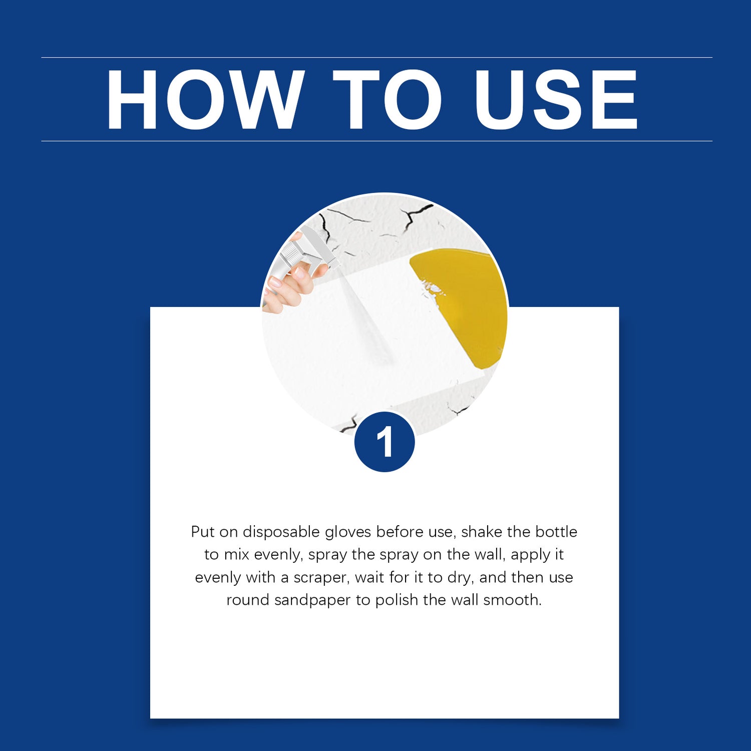Our wall refinish paint contains silicone acrylic emulsion and thickener. It can enhance the adhesion of the paint film, prevent the paint film from falling off easily, and is suitable for various material surfaces. The way to use it is very simple: wear disposable gloves before use, shake the bottle, spray the spray on the wall, apply it evenly with a scraper, and wait for it to dry, and then sand the wall smooth with round sandpaper. And can efficiently refurbish the wall, easily repair the stains on the wall to cover the defects, make the wall look new.